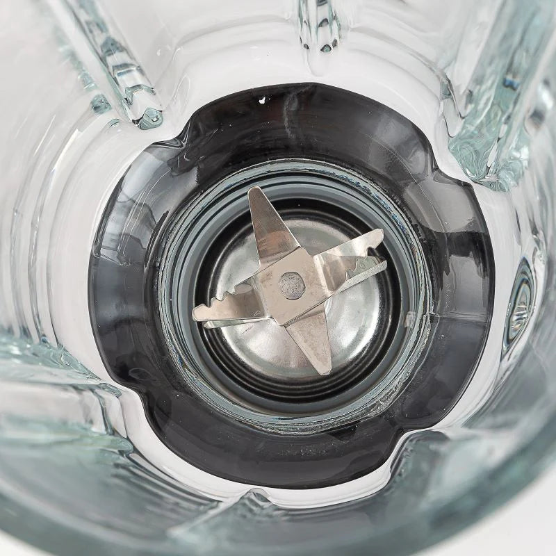 Blending machine with a clear glass jar and sturdy stainless steel base 🫗✨Black lid with a removable center cap for easy pouring and adding ingredients 🛢️🔧